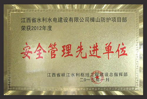 2013年2月,江西省峡今年会体育官方网站登录利枢纽工程建设总指挥部授予我公司樟山防护工程项目部“2012年度安全管理先进单位”荣誉称号,项目管理人员彭红军、邓敏被评为峡今年会体育官方网站登录利枢纽“安全生产先进个人”。