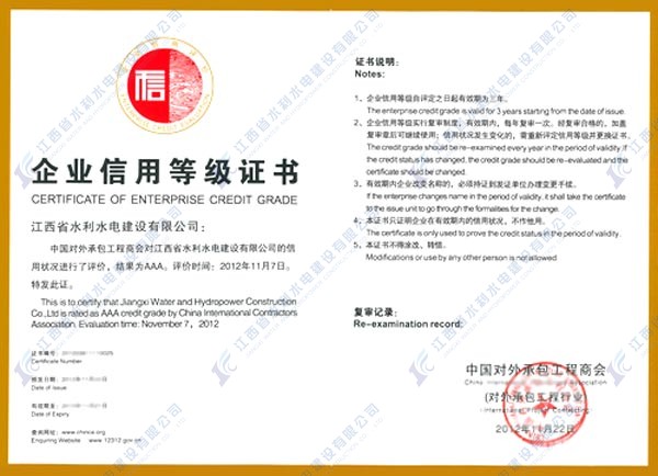 根据商务部、国资委联合发布的《商会协会行业信用建设工作指导意见》的要求,中国对外承包工程商会于2012年9月启动2012年度对外承包工程与劳务合作企业信用等级评价工作。经对外承包工程与劳务合作企业信用等级评审委员会第八次工作会议审议,江西省水利水电建设有限公司被评定为2012年度对外承包工程企业信用评价AAA级信用企业。