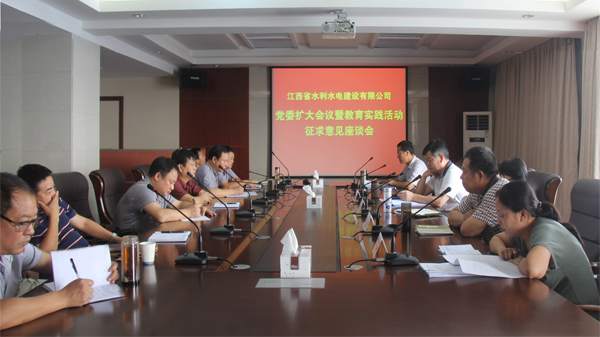 8月28日,江西省水利水电建设有限公司召开公司党委扩大会议暨教育实践活动征求意见座谈会。省水利厅副巡视员、厅教育实践活动第一督导组组长周江红、副组长郭明等领导到会指导。公司党委书记、董事长兼总经理王元旦主持大会,党委副书记王延军传达省委书记强卫同志在全省第一批党的群众路线教育实践活动工作会议的讲话。公司党委委员、各党支部书记、中层以上管理人员和群众代表等30余人参加了会议。