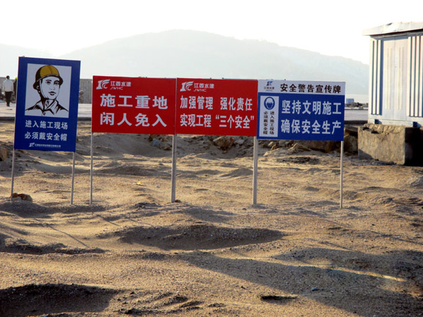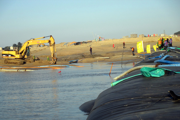 平潭综合实验区,主岛为海坛岛,位于福建省东部,与台湾隔海相望,是中国大陆距离台湾岛最近的地方,是中国第五大岛,有福建的“马尔代夫”之称。平潭综合实验区如意湖防潮闸工程项目总投资1.3亿元,我公司承建的土建工程包括排涝闸、防潮闸、公路桥、上下游两岸翼墙、防冲消能、控制房等土建工程施工(含导流明渠开挖、围堰填筑)。平潭(简称岚)年平均风速超过五级以上,大风呼啸,没来这里感受不到风有多大!依据工程设计及进度要求,在落差8m潮汐中的软基上进行围堰模袋充砂以截流海水,在恶劣地质条件的海中建闸,与潮水赛跑、跟台风抢工期,潮起潮落,给工程建设平添了许多艰难与艰辛。