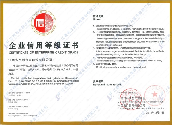 根据商务部、国资委联合发布的《商会协会行业信用建设工作指导意见》和《关于进一步做好行业信用评价工作的意见》的要求,结合承包商会关于推进行业信用体系建设的工作部署,承包商会于2015年7月启动2015年度对外承包工程企业与劳务合作企业信用等级评价工作,经对外承包工程企业与劳务合作企业信用等级评审委员会第十一次工作会议审议,江西省水利水电建设有限公司被评定为2015年度对外承包工程企业信用评价AAA级信用企业。
