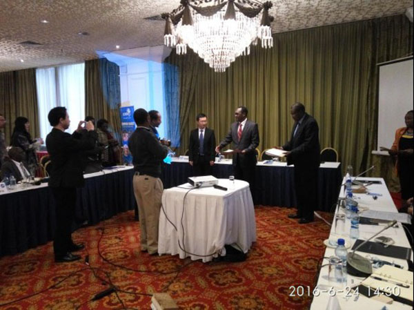 最后董国锋处长及肯尼亚商务部首席秘书Dr Chris Kiptoo共同为各国代表团成员颁发此次培训的结业证书。本次活动圆满落幕。当晚,公司董事、副总经理、海外公司总经理黄郑民及肯尼亚公司副总经理彭红军、经营部副经理丁晨阳一同出席了国际小水电中心的晚宴。