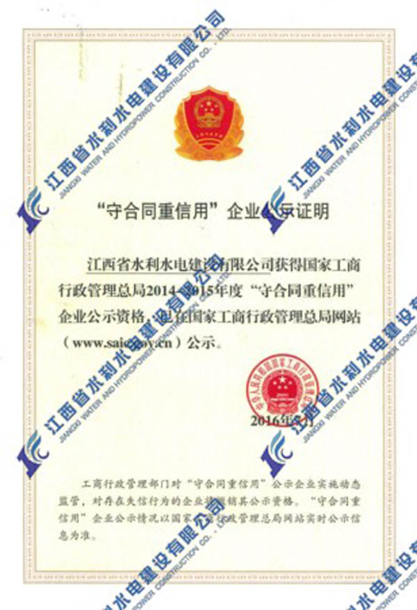 2016年我公司首次荣获国家工商行政管理总局2014-2015年度“守合同重信用”企业公示资格。“守合同重信用”公示活动,是工商部门依托合同行政监管职能组织开展的旨在推进企业信用建设的“守重”企业公示活动,是长期以来我国社会信用体系建设的重要组成部分。 诚信是企业经营发展的基石。公司坚守诚信理念,打造诚信品牌,通过不断完善信用管理体系建设,规范信用行为,并结合多种形式的员工诚信教育活动,外树形象,内强素质,取得了一定成绩。