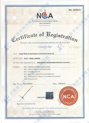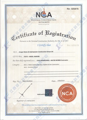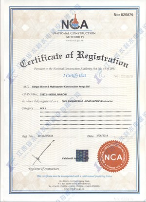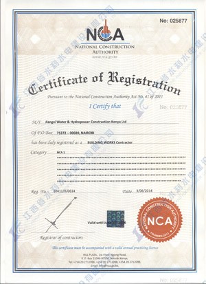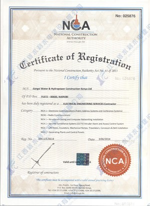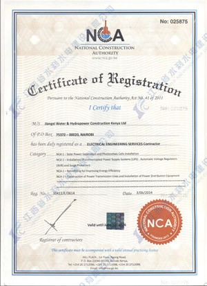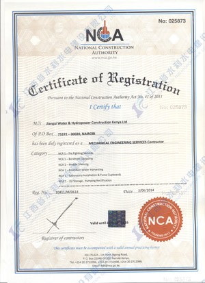 江西省水利水电建设有限公司肯尼亚分公司接到通告后,积极准备相关资料,凭借公司的技术实力和肯尼亚市场的良好业绩,最终取得所有六项的一级证书。其中包括:水利施工一级,公路工程施工一级,房屋建筑工程施工一级,结构施工一级,电力工程施工一级和机电工程施工一级,有力地提升公司的品牌影响,提升了公司资信竞争力,为公司在肯尼亚各项工作的全面深入开展创造了积极有利的条件。