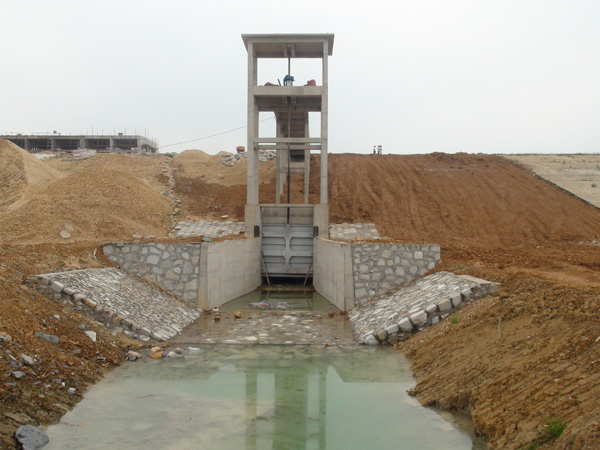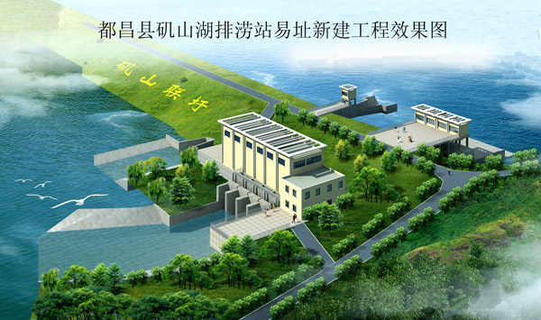 为配合江西省都昌县打造“城依水建、水在城中、山水相依”的宜居园林城市建设重点项目——滨水西区开发的需要,都昌县矶山湖排涝站从矶山湖上坝易址矶山湖下坝,新建工程由电排站和自排闸组成,泵站装机容量4×800kw,治涝标准采用10年一遇暴雨,治涝面积44平方公里,是原矶山湖上坝排涝站排涝能力的2倍,属中型排涝站。
