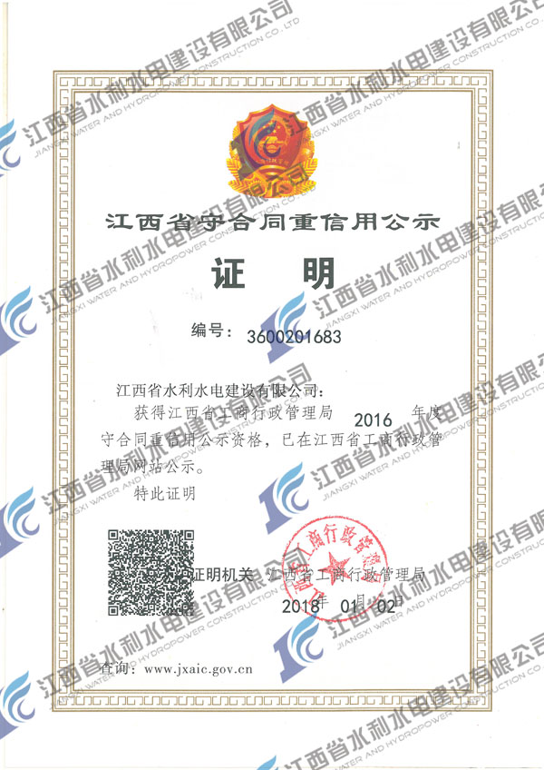 近日,公司获评2016年度江西省守合同重信用公示资格。