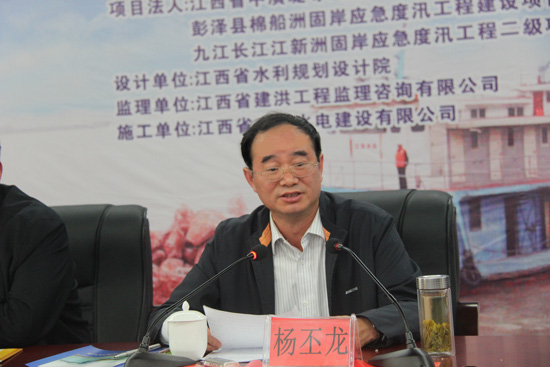 省水利厅副厅长杨丕龙在会上作了重要讲话,他对九江长江江心洲固岸应急度汛工程棉船洲1标和江新洲1标进展予以充分肯定,并代表省水利厅党委向有关单位和部门对水利建设的关心和支持表示衷心感谢,向奋战在固岸应急度汛工程建设一线的参建各单位和工作人员表示亲切慰问。
