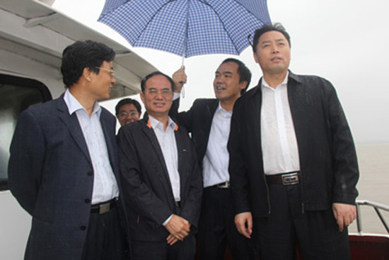 9月29日,省河湖局在彭泽县组织召开了九江长江江心洲固岸应急度汛工程项目验收会议,由刘晓明副局长主持。9月30日上午,按照会议日程,参加验收会的各单位代表乘坐快艇前往棉船洲1标复排段砌石护岸完工段察看工程情况。彭泽县下起了大雨,长江江面阵风达到六级,省水利厅、省发改委、九江市政府、省水利厅有关处室及有关单位负责人,九江市水利局等有关单位领导不顾船身摇晃和瓢泼大雨,来到船舷及甲板上察看工程并听取有关情况汇报,对我公司发扬善打大仗、敢打硬仗的精神,科学组织,勇往直前,夜以继日,连续作战,上足施工设备,充实利用长江江面间断睛好天气抢工期,保证了工程的顺利完工,并在今年长江汛期发挥有效的防洪保安作用,给予了充分肯定。