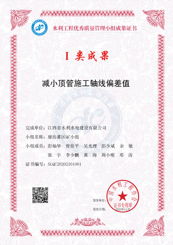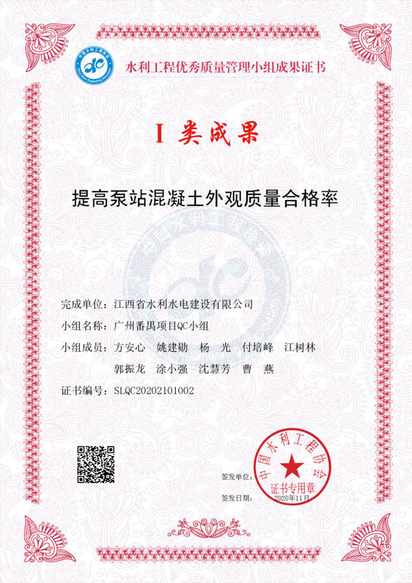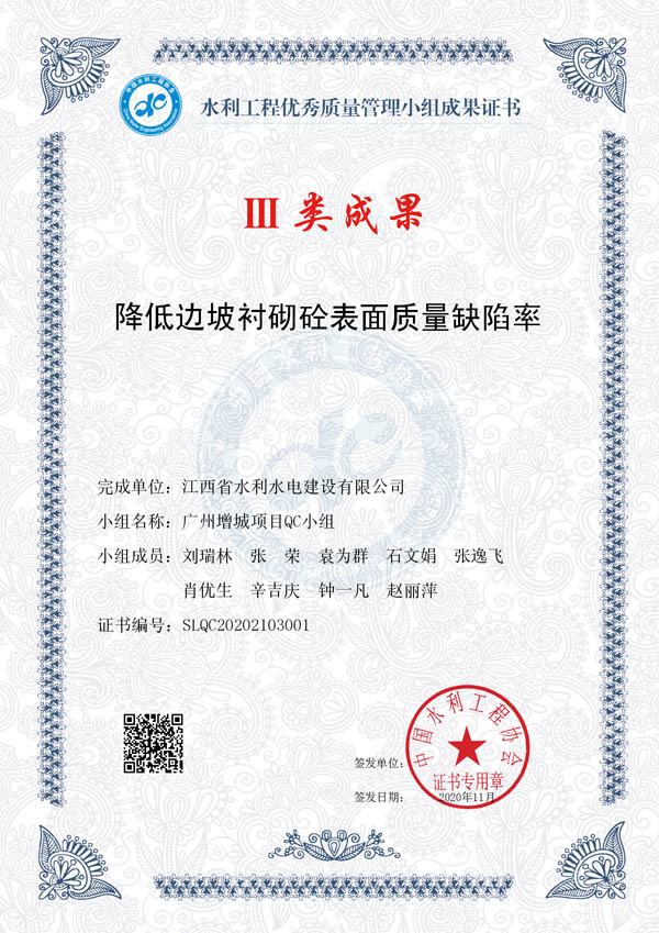 其中:廖坊灌区QC小组编写的《减小顶管施工轴线偏差值》获I类成果奖、广州番禺项目QC小组编写的《提高泵站混凝土外观质量合格率》获I类成果奖、广州增城项目QC小组编写的《降低边坡衬砌砼表面质量缺陷率》获III类成果奖。