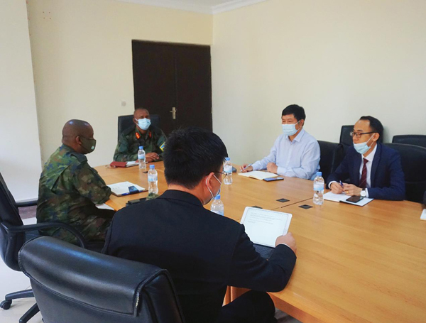 张周平一行会见了军事学院项目业主--卢旺达军事学院司令。双方就疫情期间项目的施工情况进行了充分的交流,气氛热烈融洽。双方非常珍惜和重视此次合作,表示会全力支持推动项目进展,并期待两个团队在日后工作中能够继续保持积极有效的沟通,务实地解决施工难点,尽早完成预期建筑施工目标。