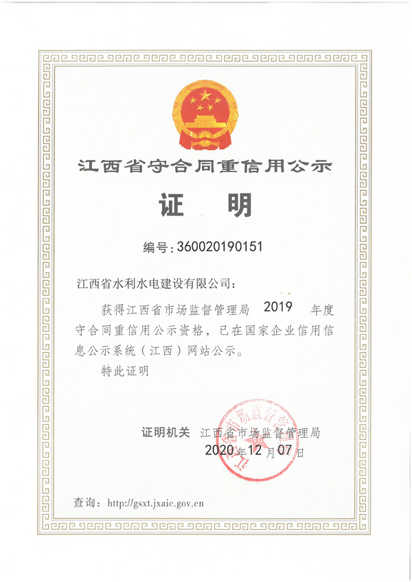 近日,公司获评2019年度江西省守合同重信用公示资格。