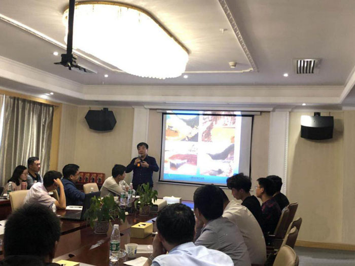 现场参观结束后,学习团参加了技术培训和经验交流会。总经理助理杜凌主持了开班仪式。总工程师胡鸿煌、项目副经理李成,对洋前坝水库的大坝总布置、大坝施工导流、大坝及供水管道施工技术细节等,通过文字、图片、视频等组成的PPT课件为学员授课,并就学员提出的问题逐一进行了解答。