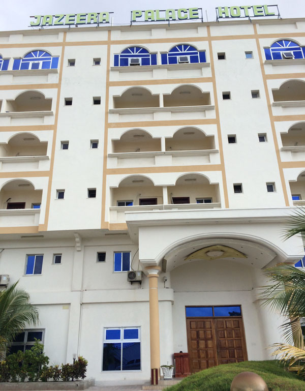 我们入住的是半岛皇宫酒店,也是中国驻索使馆的临时办公产所。三道门的安全防护可谓警备森严,战争国家的气象从这可见一斑。酒店内布置简单,但设施齐全,与酒店外充满杀气的气氛不同,酒店内人来人往,商人喝着咖啡悠闲地谈着生意。我们也坐着边喝咖啡边商谈工作计划,不时有索马里人来打招呼,用中文说“你好”,并客气地握手表示热情欢迎来到摩加迪沙。