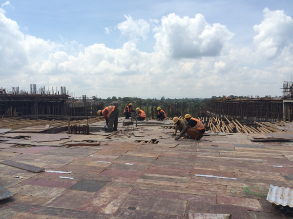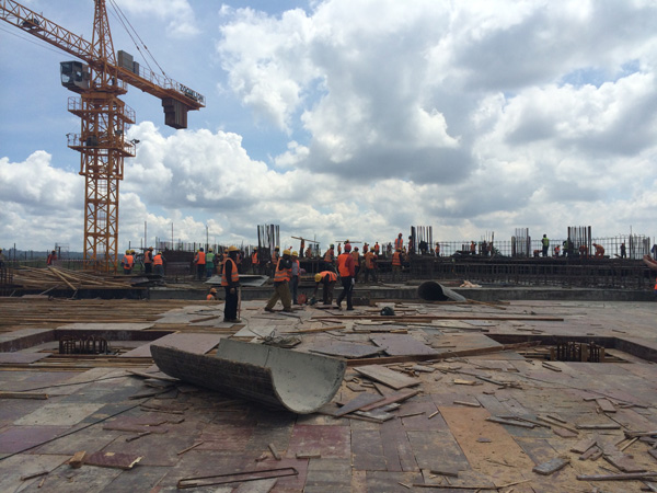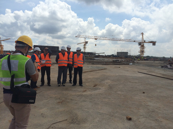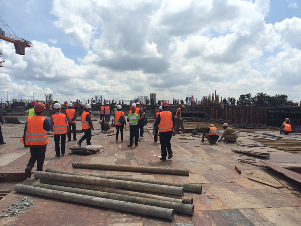 “双河”项目是一个集零售商场、现代办公楼、公共娱乐以及配套设施的综合性工程,作为东非最大的在建城市综合体,总建筑面积为18.2万平方米,单层面积就超过四万多平米。虽然出国前我对“双河”项目就有一定的了解,但亲临现场,感受工地的壮观,内心仍然受到巨大的震撼。这个项目涉及到的工程类别较多,施工统筹及安全质量监控难度较大。在施工现场,我们看到各作业工种工作安排得井井有条,各类安全标识及安全设施科学规范,虽然现场施工作业人数超过1000多人,但让人感觉既热火朝天,又忙而不乱有条不紊地进行着。