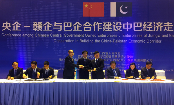 公司董事长王元旦与中国进出口银行江西省分行、中国葛洲坝集团国际工程有限公司签署巴基斯坦开伯尔-普赫图赫瓦省350MW瑞开水电站项目战略合作协议