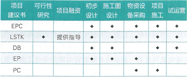 常见的工程总承包方式。工程总承包的主要方式有:设计采购施工总承包(EPC )、交钥匙工程总承包 (LSTK )、设计建造工程总承包(DB )、设计采购总承包 (EP )、采购施工总承包(PC )。不同的承包方式,参与项目实施过程中的不同环节(见表1 )。