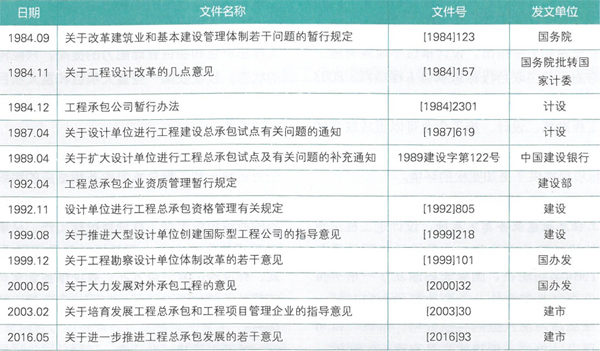 20世纪80年代,我国相关部门就下发文件,要求在设计、施工企业组建开展工程总承包的试点,从国家颁布的一系列文件中可以看出我国在推广工程总承包业务方面的几点变化(见表2 )。