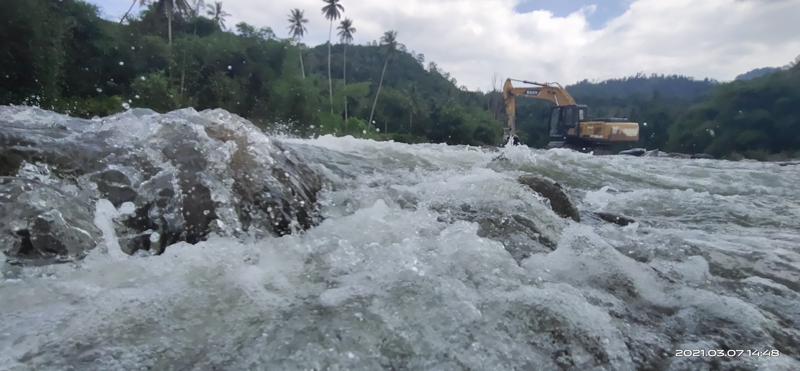 文字说明;该照片是在伯恩河中用手机拍摄,是印尼疫情复工后开辟新施工道路时的场景。在奔腾的洪流中激流拍石,浪花飞溅,挖机迎难而上,象征着公司坚韧不屈的品格、水建人大无畏的工作热情。对岸的满山绿树在蓝天白云下,勾勒出一幅壮丽的画面,预示着伯恩电站的美好未来,高高的椰子树,象征着集团公司辉煌的明天!