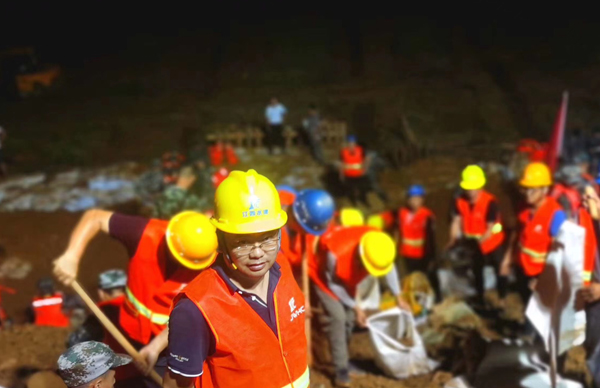 彭灿华是第一时间带领抗洪抢险队员赶赴现场与洪水战斗的先遣军。他连夜指导施工人员开展抢险工作,天黑路滑,他几次摔倒在泥泞中,眼镜上沾满了泥点,浑身早已被泥水覆盖,即便这样,他还是一边了解汛情水情,一边指挥抢险,一边将一线汛情汇报给公司,一边顶着倾盆大雨加入到抢险的队伍中,装袋抬土,和抢险施的队伍们奋战在一起。
