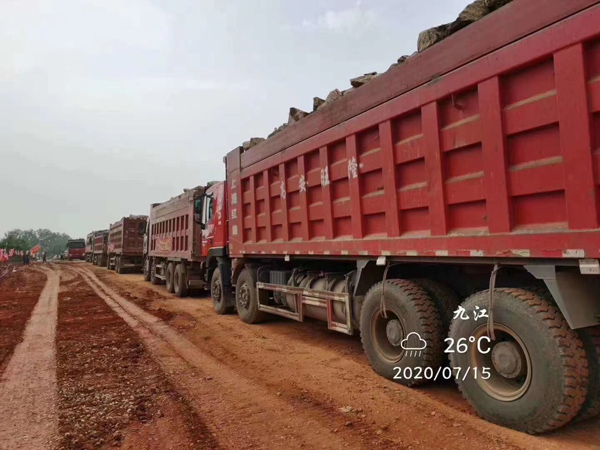 7月15日凌晨,货车连夜运送石料入场,现场材料调度人员彻夜不休,仅借助货车大灯照明,顺利完成调度工作。当日,决口成功封堵70米。