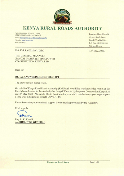 收到来自江西水建捐赠的防疫物资后,肯尼亚乡村公路局局长由衷地表示感激,并向肯尼亚分公司写了一封感谢信,他在信中表示:“江西水建友好慷慨的捐赠,将为我们对抗新冠肺炎疫情提供长远的支持,肯尼亚乡村公路局对此深表感激。”